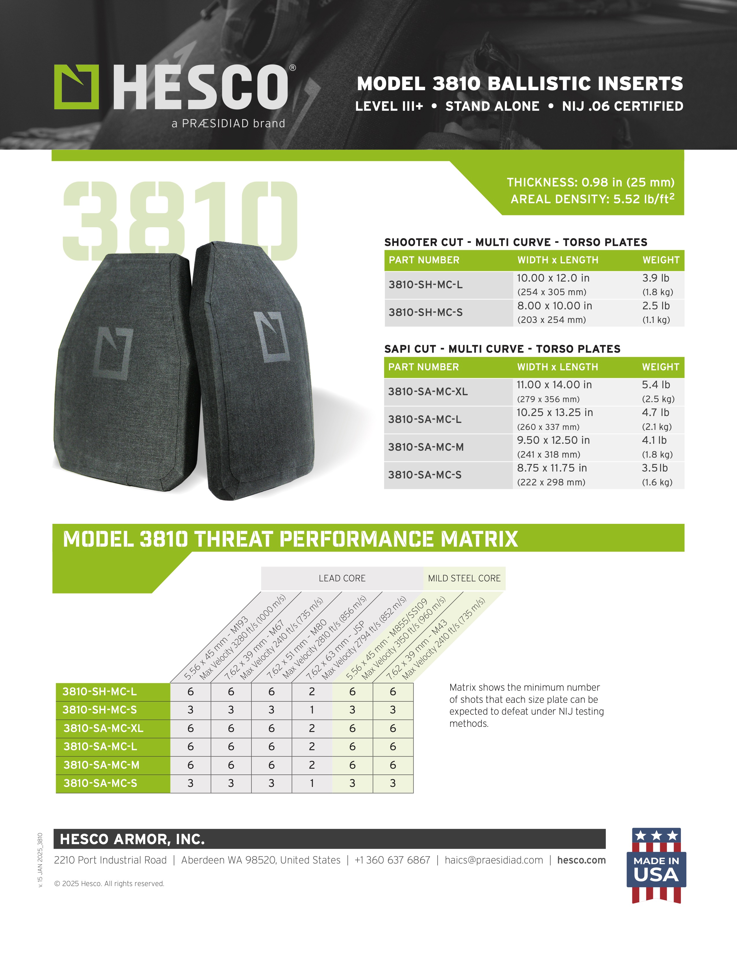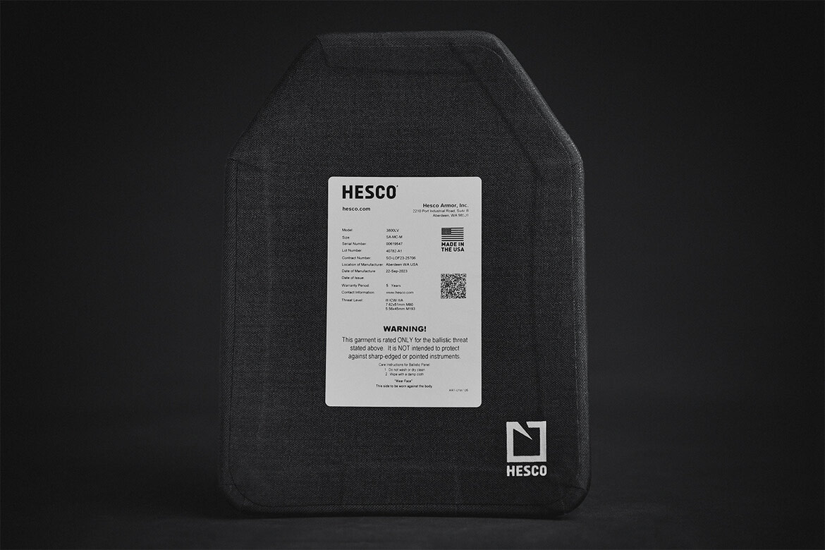 Hesco 3810 SAPI Cut plates offer NIJ Level III+ protection without the need for a Soft Body Armour backer, stopping common rifle rounds such as 5.56x45mm M855 and 7.62x51mm M80 Ball. Built with advanced Spectra® composites, these plates are designed to handle multi-hit scenarios while maintaining a low weight of just 3.9 lbs in the 10x12-inch size. The water-resistant Cordura® coating adds durability and helps the plates stay reliable in harsh conditions.