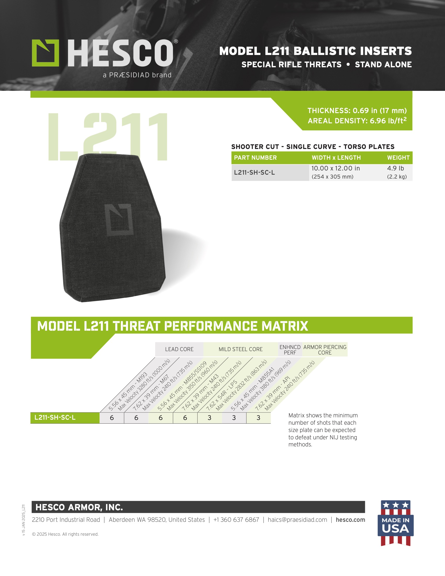 Hesco’s L211 plate provides a robust yet lightweight solution for those who face higher-level threats. Engineered with advanced ceramic and polyethylene composites, it delivers Level III+ protection against rifle rounds like M193, M855, and 7.62x39mm API. Despite its formidable stopping power, the L211 weighs only 4.9 lbs (2.2 kg) in the 10x12-inch size, measuring a slim 0.69 inches (17 mm) thick.