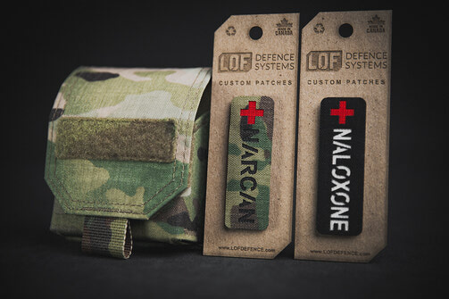 This compact Naloxone patch measures 0.9" x 2.7" and features a red medical cross alongside bold white text for rapid identification. Made from American-milled 500 Denier CORDURA® and backed with genuine MILSPEC Hook Velcro®, it's engineered to last without stitching or marrowing. Designed specifically for LOF’s Single and Double Narcan pouches, this patch also fits seamlessly onto any loop Velcro® surface—ideal for med kits, bags, or duty vests where opioid overdose intervention tools are stored.