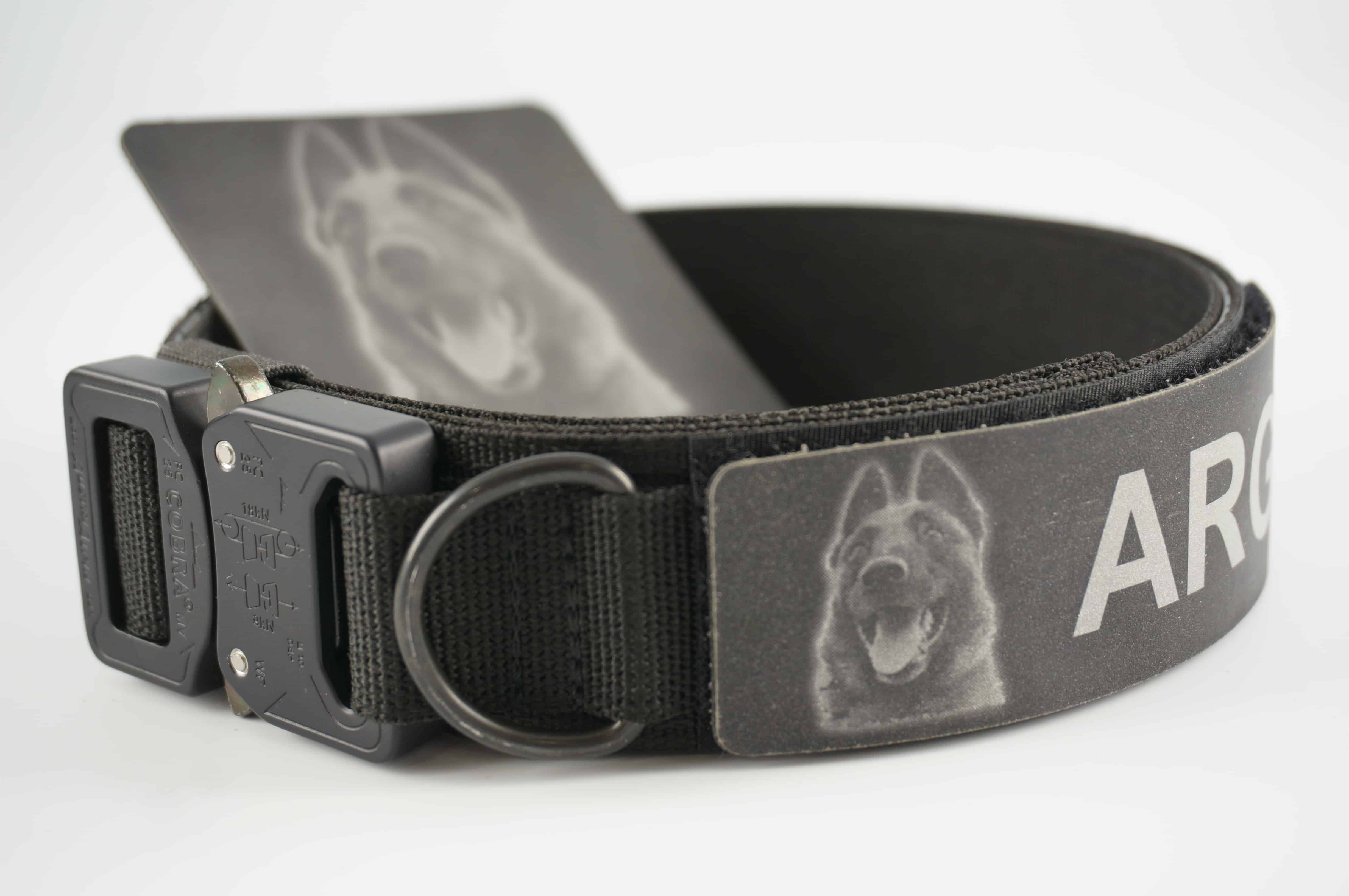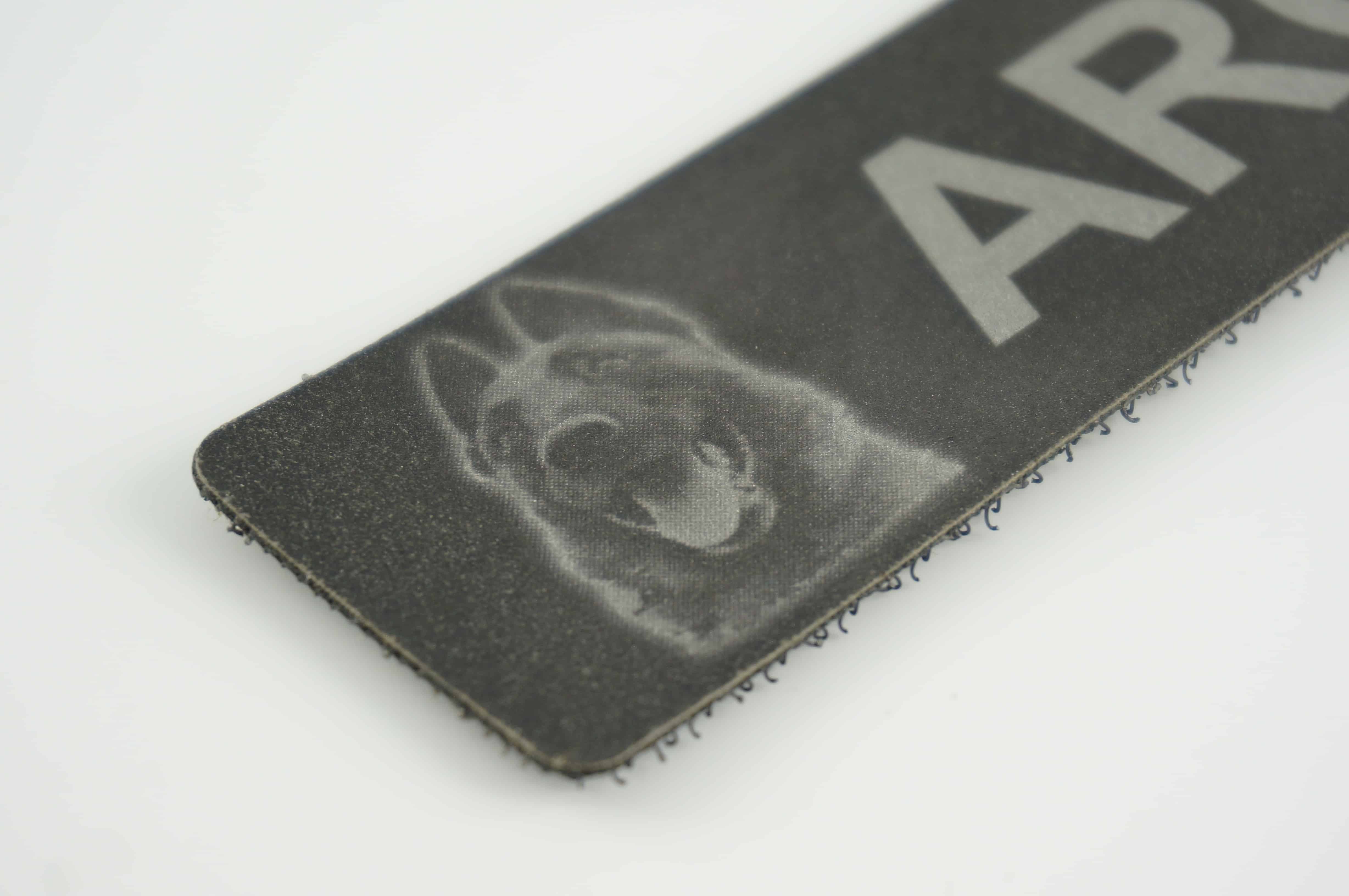 This custom made Personalized K9 Name Patch features an engraved portrait of your K9 along with their name. These patches are 1.5 inches by the length of the dogs name and are engraved onto a MilSpec 3M reflective and adhered to a Hook backing for easy attachment to jackets, bags, vests and other items with a loop platform .